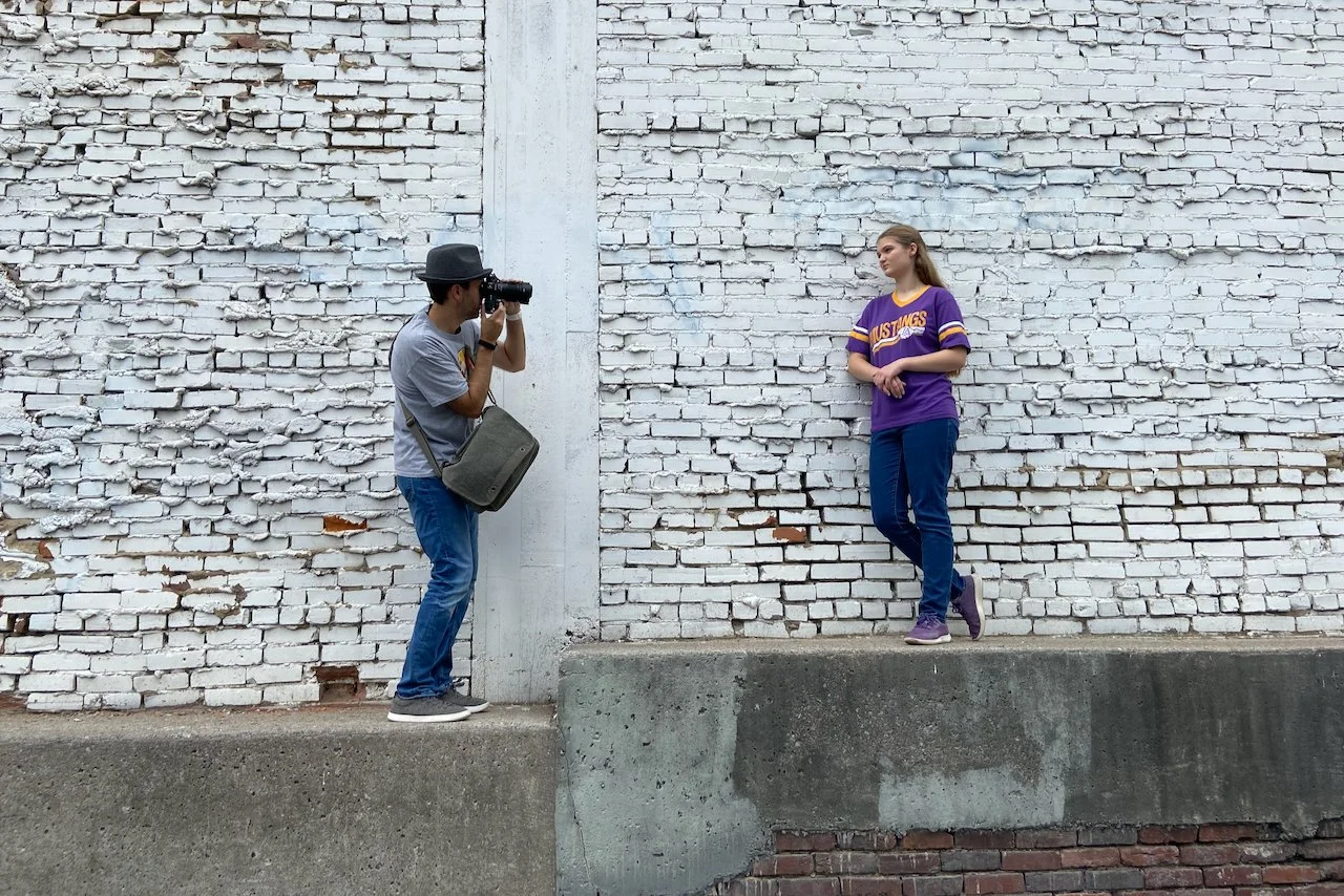 Olivia took a candid photo of me shooting Kate against a jagged, white brick wall at the back of a parking lot on 5th Avenue and Commerce Street. The end results is the first image in the gallery above.
